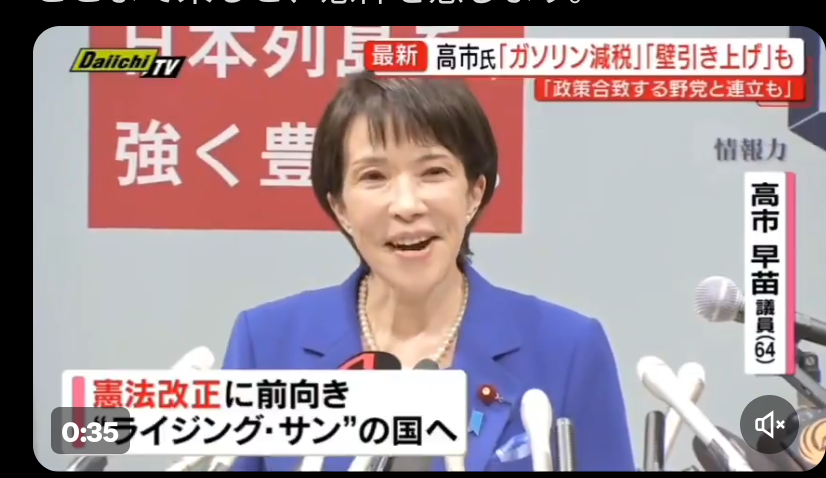 薬でもやってるような高市早苗 政治関連 2025.09.22 こんなのが総理候補。この国も終わりだ 「ニッポンてなんでニッポンて言うんやろ。それは、ライジングサンですよね。」全く意味がわからない。ここまで来ると、恐怖を感じます。 pic.twitter.com/MVREuCfh7W— 毬谷友子 🕊 TOMOKO MARIYA (@mariyatomoko) September 20, 2025